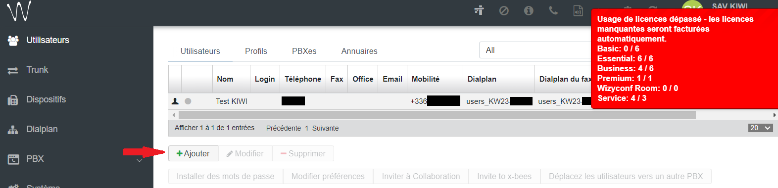 2. Trier vos utilisateurs par le champ Téléphone pour connaître le prochain disponible, puis cliquer sur Ajouter.