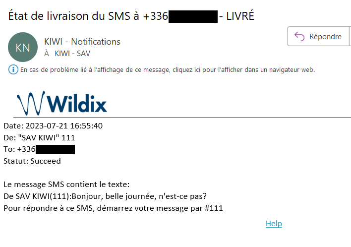 3. Vous recevrez un mail d'état de l'envoi du SMS