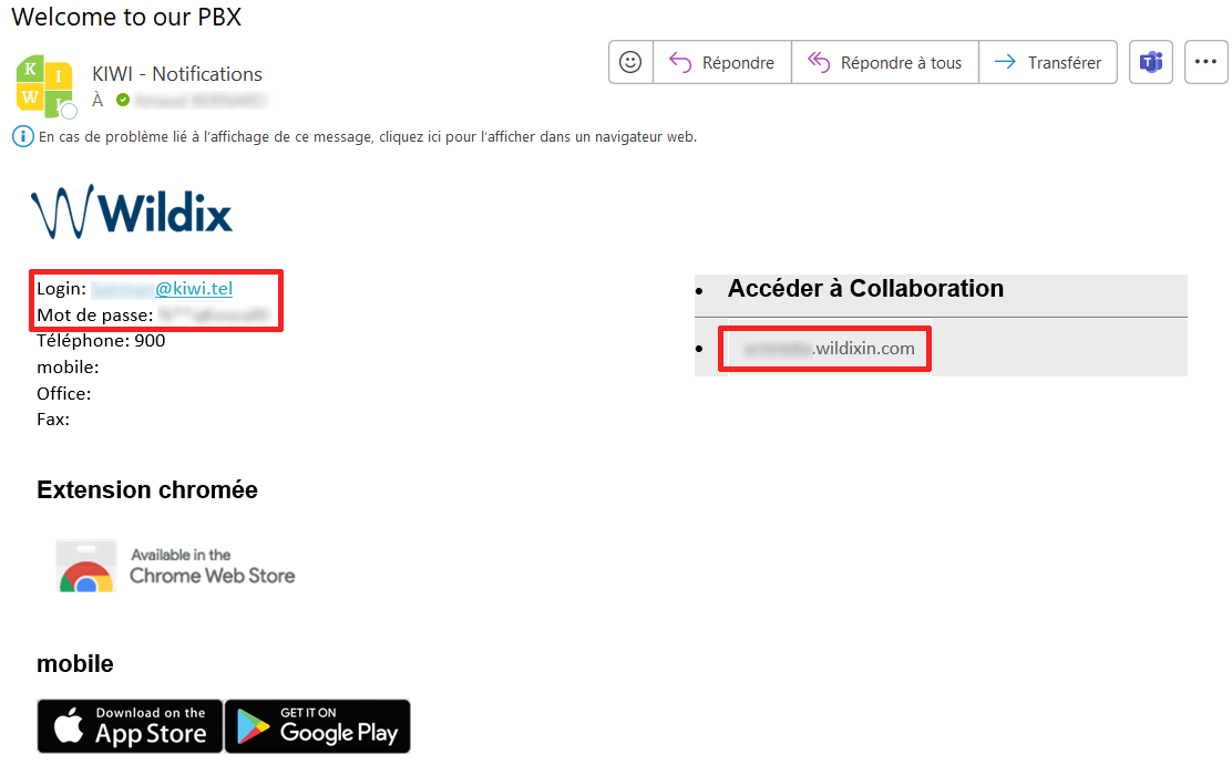 - Dans votre navigateur internet, copiez ou cliquez sur l'URL présente dans le mail de bienvenue (par exemple: https://kiwi.wildixin.com)