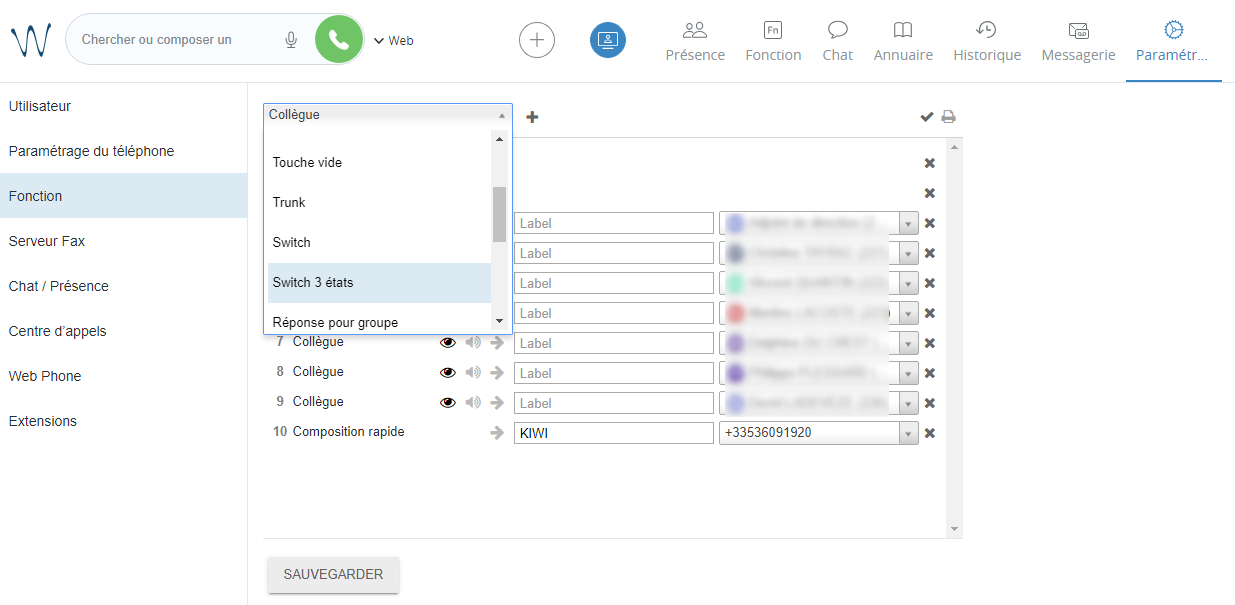 Les touches de fonction configurées dans cet onglet vous permettent de contrôler les collègues, les fonctionnalités des téléphones de bureau Wildix (WorkForce, WelcomeConsole, Vision, SuperVision, etc.), les applications iOS/Android et Fonction